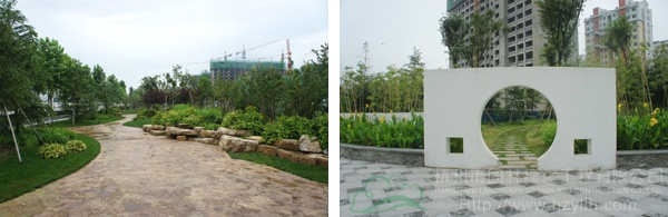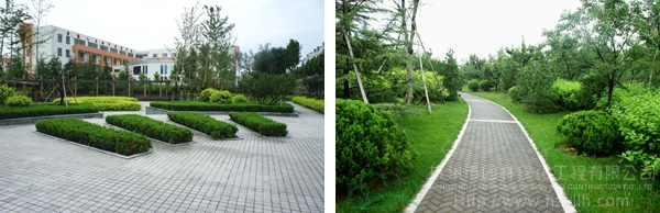 每個(gè)景觀(guān)節(jié)點(diǎn)上,植物的配置方法都是不一樣的,如在下沉廣場(chǎng),主要是以小龍柏、金葉女貞等小灌木片植成方形或弧形,間或點(diǎn)綴石楠、梅樹(shù),看起來(lái)規(guī)整、簡(jiǎn)潔;而在設(shè)計(jì)風(fēng)格為江南園林的南廣場(chǎng)上,是將貴重的造型油松單植,通過(guò)不同的組合,形成三個(gè)風(fēng)格相近的綠島,周邊種植美人蕉、玉簪、竹子,并砌起白墻,上面開(kāi)圓形拱門(mén)或圓窗,散發(fā)出詩(shī)意江南的靜謐和婉約氣息?!坝雾降朗秦灤┱麄€(gè)景觀(guān)的軸線(xiàn),為了形成曲徑通幽的景觀(guān)效果,我們將對(duì)植、孤植、叢植都多種方法結(jié)合運(yùn)用,特別是在三叉路口,多種植海棠、櫻花、杏花等,一方面,花開(kāi)的時(shí)候,綠葉間繁花點(diǎn)點(diǎn),會(huì)吸引人們不斷向前探尋更多的美景;而花落之后,茂密的枝葉又形成隱隱約約的視覺(jué)感受,前方轉(zhuǎn)過(guò)彎后風(fēng)景什么樣,又讓人很想去看看?!备呓?jīng)理笑著說(shuō)。