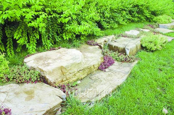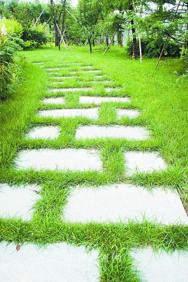 ▲用草皮鑲嵌的花崗巖汀步