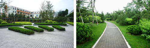 每個景觀節(jié)點上,植物的配置方法都是不一樣的,如在下沉廣場,主要是以小龍柏、金葉女貞等小灌木片植成方形或弧形,間或點綴石楠、梅樹,看起來規(guī)整、簡潔;而在設計風格為江南園林的南廣場上,是將貴重的造型油松單植,通過不同的組合,形成三個風格相近的綠島,周邊種植美人蕉、玉簪、竹子,并砌起白墻,上面開圓形拱門或圓窗,散發(fā)出詩意江南的靜謐和婉約氣息?!坝雾降朗秦灤┱麄€景觀的軸線,為了形成曲徑通幽的景觀效果,我們將對植、孤植、叢植都多種方法結(jié)合運用,特別是在三叉路口,多種植海棠、櫻花、杏花等,一方面,花開的時候,綠葉間繁花點點,會吸引人們不斷向前探尋更多的美景;而花落之后,茂密的枝葉又形成隱隱約約的視覺感受,前方轉(zhuǎn)過彎后風景什么樣,又讓人很想去看看?!备呓?jīng)理笑著說。