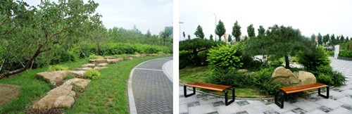 而在道路十字路口的節(jié)點處,則主要是用10cm×10cm的小花崗巖鋪地,鋪出來的路面整潔、平坦,看似簡單,實則對施工技術(shù)要求相當高。草坪中的地面鋪裝,則采用花崗巖汀步,用錯縫鋪裝法,兩塊花崗巖之間用草皮鑲嵌,就像給每塊花崗巖鑲了一道綠邊,與旁邊的草坪和諧地融為一體。貫穿整個工程的游憩步道,全部采用“人字形”的鋪裝方法,中間用透水磚、兩邊以花崗巖鑲邊,透水磚價格不高,用以鑲邊的花崗巖是利用了鋪裝中剩余的邊料,雖然用料簡單,但通過對技術(shù)的嚴格要求,鋪出的路面卻整潔而不失韻味,是一種實用、環(huán)保、節(jié)約的做法。
