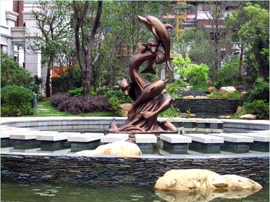 景觀小品是景觀中的點(diǎn)睛之筆,一些造型優(yōu)美的藝術(shù)小品,更是讓空間環(huán)境生動起來的關(guān)鍵因素。在保利·拉菲,帶有濃郁意大利氣息以及中西文化合璧的景觀小品隨處可見。入口處的歐式水景幕墻利用中國黑、黃銹石燒面、砂巖雕花巧妙結(jié)合,形成一幅精美的藝術(shù)畫面,幕墻中不斷噴涌的水流激起陣陣白色的漣漪,將后面寫有“保利·拉菲”字跡的景墻襯托得清爽大氣,在陽光照耀下,呈現(xiàn)出流暢、動感的畫面。特別引人注目的是模仿圓明園四大獸首制作的水景雕塑,牛首、豬首、猴首、虎首這四大獸首,形象上采取了西方動物的特征,融合了中國的傳統(tǒng)文化與西方的特色魅力,當(dāng)細(xì)長的水流從四大獸首的口中源源不斷地吐出、落入前方的水池里時(shí),就與從下而上噴出的涌泉形成互動,一上一下、一細(xì)一粗,前方再配以色彩絢麗的花草,形成一處動靜相宜、格調(diào)清新的水景。