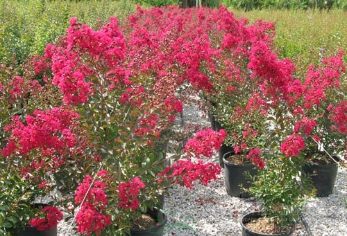 “紅寶石”紫薇:株形矮小,萌蘗性強,耐修剪,花期長,花形緊湊,花色深似寶石,既可作盆栽觀賞,又可作花境點綴。