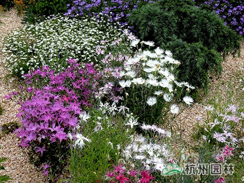 石竹品種多樣、花色從白色、粉色、紫紅色至紅色均有,花瓣形態(tài)變化也較多,是花境中良好的中景至前景材料。