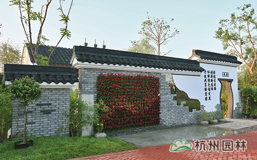 入口一組大氣的景墻組合先聲奪人,靈感來源是浙江絲布發(fā)展中古染坊的形態(tài)與內(nèi)涵,左側(cè)的一堵長景墻,本身平淡無奇,但配上了那一組晾曬絲布藝術(shù),頓時給人眼前一亮的感覺;右側(cè)的這面景墻則為傳統(tǒng)古染的縮影,輔以花卉點綴,正是歷史與花藝的完美融合;正中的景墻則極富山水意境,借景入畫,山石,松柏,渾然一體。