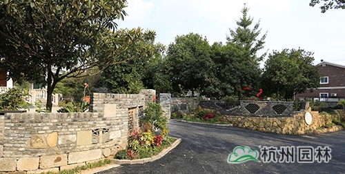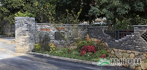 錢(qián)三組共有31戶人家,以前,這里家家都是高墻大院,雖然每家的小樓都蓋得很有特色,但卻被高高的院墻擋住了院內(nèi)的風(fēng)光,而且整體綠化景觀單一,缺乏本土特色和文化氣息。如今,高高的圍墻被拆除,改為以舊青磚為主,搭配鋁合金欄桿,以老石板、舊瓦片、老石磨、老石鼓等作為點(diǎn)綴,懷舊物件與現(xiàn)代元素有機(jī)結(jié)合,營(yíng)造出全新的集古樸與時(shí)尚于一體的敞開(kāi)式景墻。在景墻內(nèi)側(cè)種植桂花、意大利絡(luò)石等綠籬,墻外地面種植麥冬等常綠草本植物;在每家庭院入口兩側(cè)和一些節(jié)點(diǎn)處設(shè)置小花境,種植各類(lèi)常綠、色葉、草花等植物,營(yíng)造出風(fēng)格多樣的花境景觀,在軟化景墻生硬感的同時(shí),景觀更加豐富多變。
