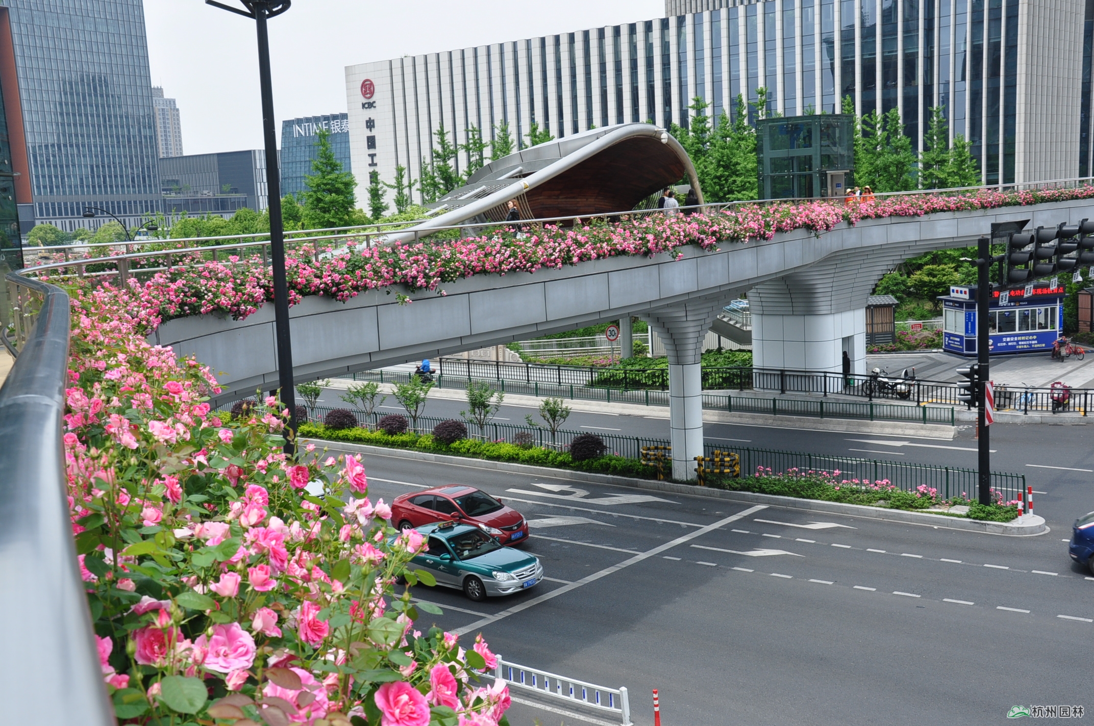 位于新塘路和慶春路交叉口的慶新天橋是新塘路綜合整治工程的標(biāo)志性建筑之一,也是杭州首座仿生態(tài)學(xué)原理的異形人行天橋。橋面獨特的景觀造型宛如一條風(fēng)景秀美的彩色飄帶,大量月季沿橋面外側(cè)護(hù)欄種植,月季花盛開時節(jié),橋面仿佛戴上了一條色彩絢麗的花環(huán),美不勝收,充分體現(xiàn)了杭州包容、大氣、開放的時代風(fēng)貌、都市氣質(zhì)和國際視野。