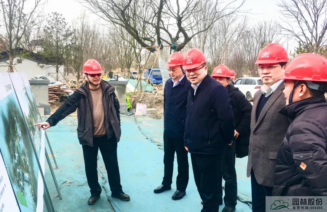 ▲胡俠(中)一行實地察看浙江室外展園施工進(jìn)展情況