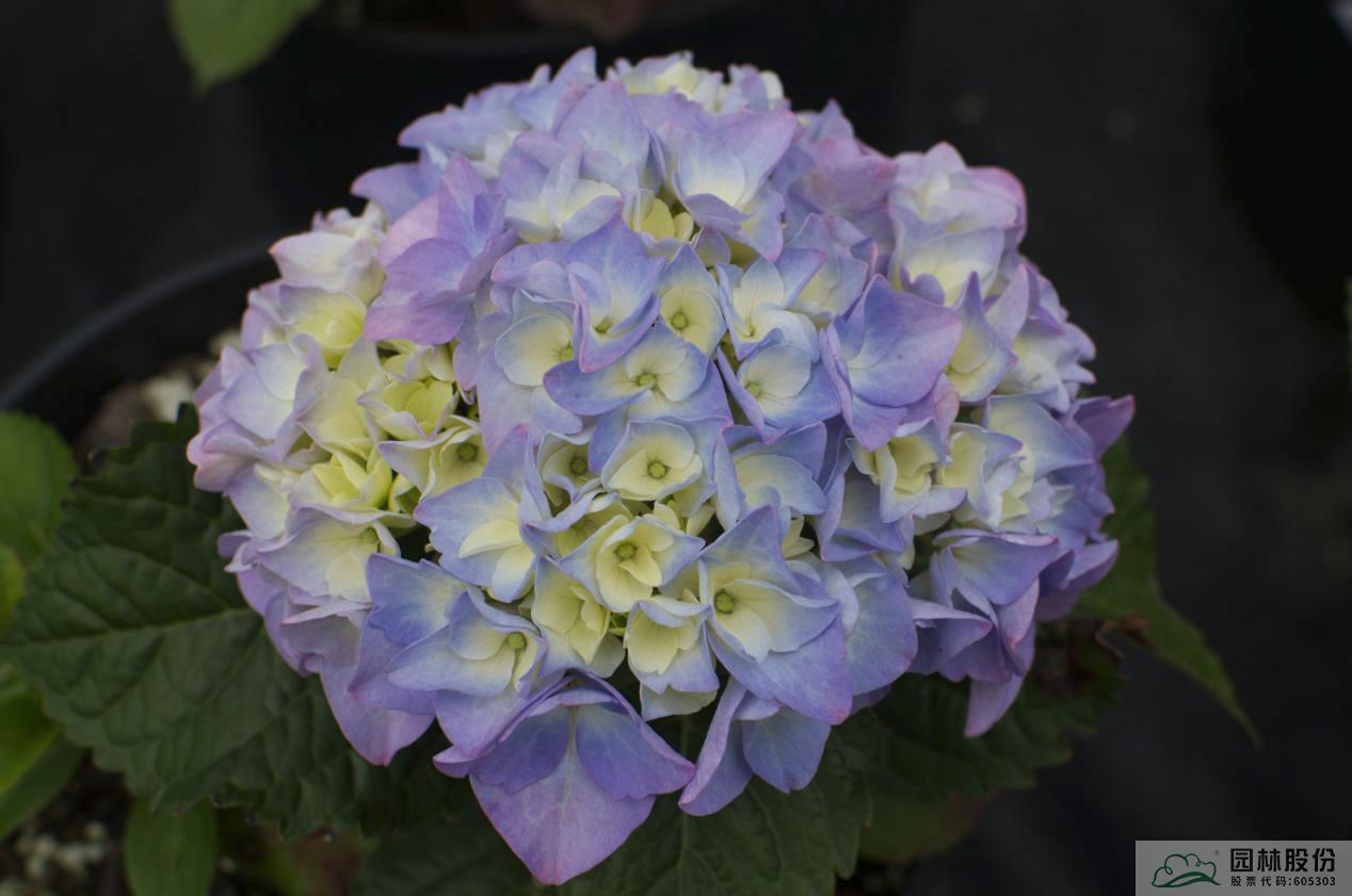 葉片呈卵形,中綠色;扁球狀花,萼片(花瓣)較大,初開時(shí)花瓣為亮黃綠色,隨后會(huì)慢慢變?yōu)榧t紫、粉藍(lán)等。盛花期,其花瓣層層疊疊,絢麗多彩,明媚動(dòng)人。杭州5月上旬開花,可延續(xù)至6月下旬。